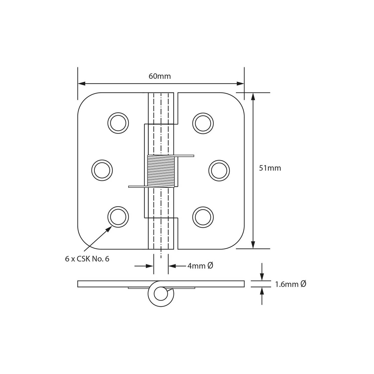 A spring hinge with radiused corners and countersunk holes. Available sprung open or closed.