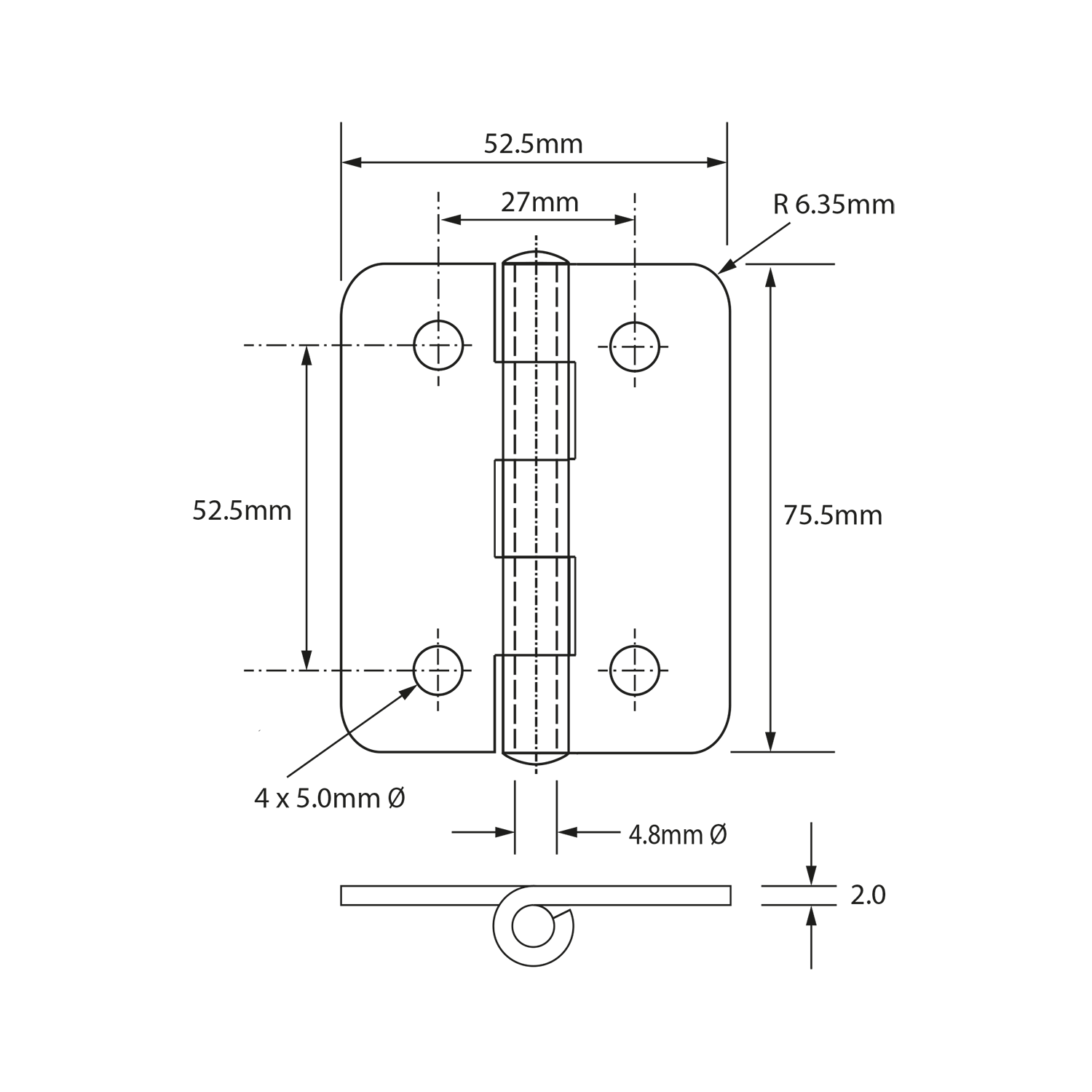 A special purpose hinge with radiused corners and Phosphor Bronze riveted pins