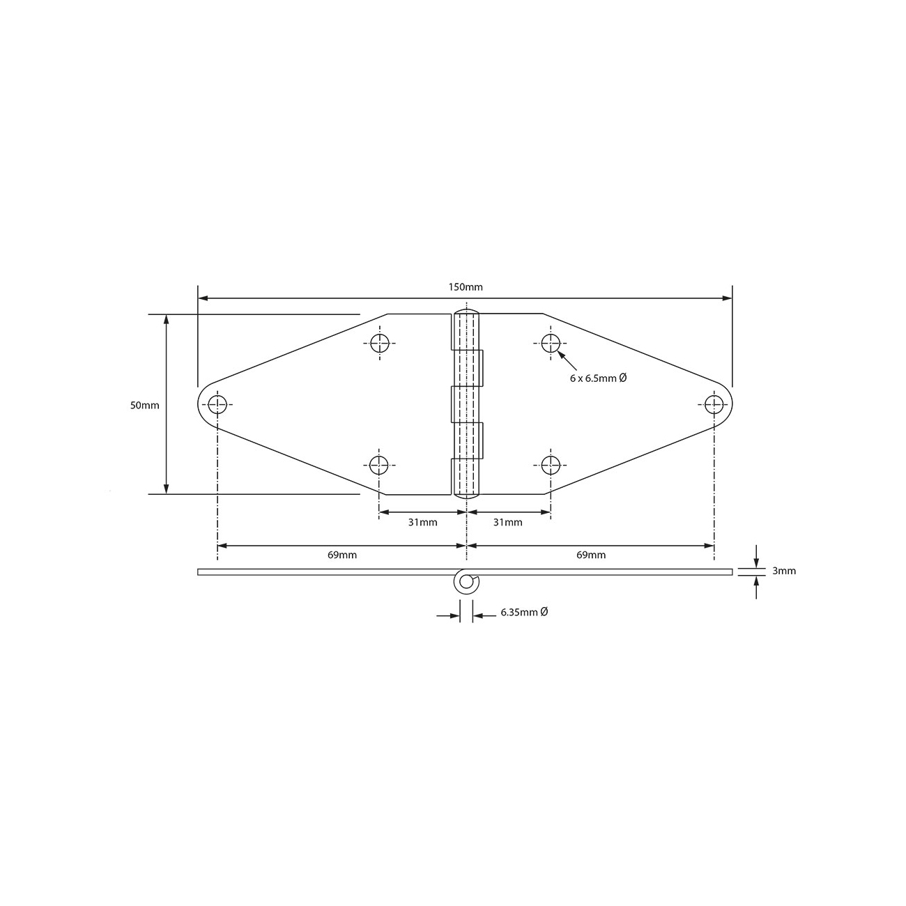 A robust heavy duty shaped hinge, supplied with riveted pins, available with or without holes
